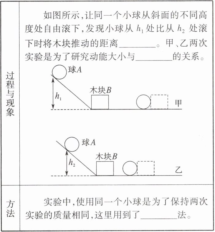 过程与现象:同一个小球质量相同,从$h_1$($h_1>h_2$)处滚下,到达水平面速度更大,根据动能与速度关系(质量相同时,速度越大动能越大),将木块推动的距离更远;甲、乙两次实验,小球质量相同,高度不同(速度不同),是为了研究动能大小与速度的关系。