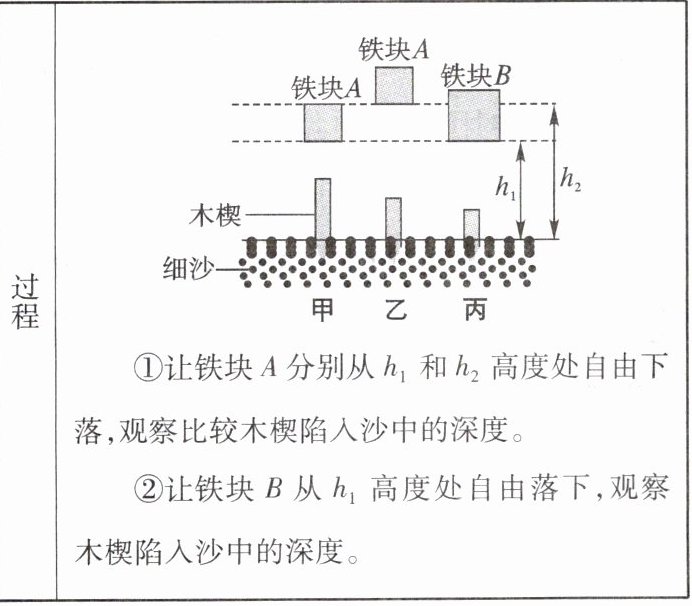 结论:探究重力势能与质量关系,要控制高度相同,改变质量,所以比较乙、丙两组实验(高度$h_1$相同,铁块$A$、$B$质量不同);甲、乙实验,质量一定(都是铁块$A$),高度$h_1>h_2$,木楔陷入沙中深度不同(重力势能不同),得出质量一定时,高度越大,重力势能越大 。