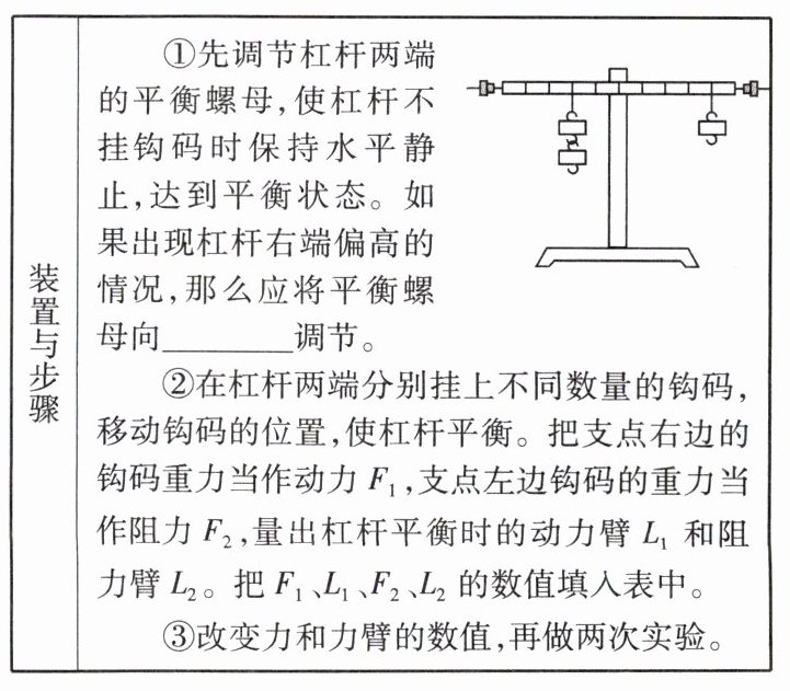 ①解:杠杆右端偏高,说明杠杆左端偏重,根据杠杆平衡原理$F_1L_1 = F_2L_2$(此时$F_1$、$F_2$可看作杠杆自身重力,力臂为支点到重心距离),应将平衡螺母向右调节,增大右端力臂(或减小左端力臂效果),使杠杆平衡。