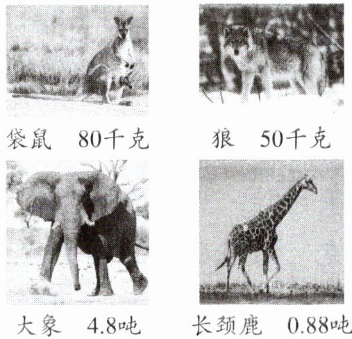 大象(4800千克) > 长颈鹿(880千克) > 袋鼠(80千克) > 狼(50千克)