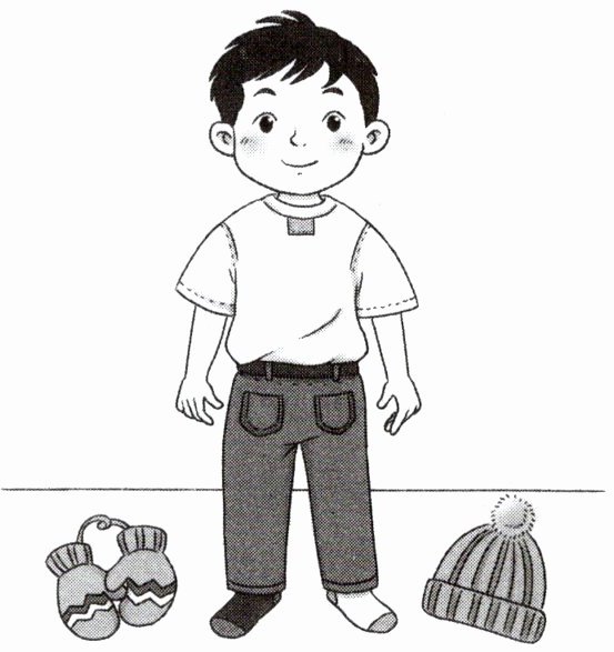 It's a summer day. My brother Pengpeng and I will go to the park. Pengpeng is 3 years old. He wants to dress by himself. So he puts on his pants. The zipper (拉链) is in the back (后面). He puts on his T-shirt. The tag (标签) is on the outside (外面). He puts on his socks. One sock is white. The other sock is black. Then Pengpeng will put on his hat and mittens (手套).