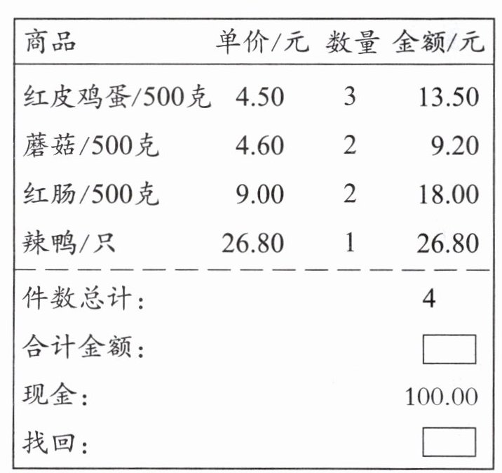 要计算找回的金额,需要先计算所有商品的总金额,然后用支付的现金减去总金额。