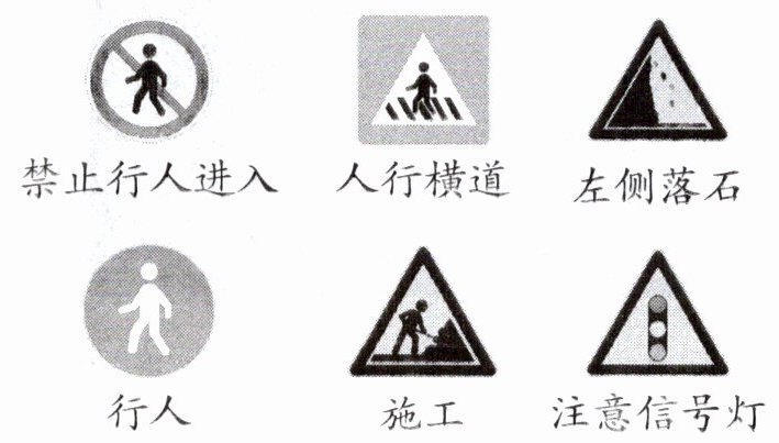 【解析】:题目中展示了六个交通安全标志,分别是禁止行人进入、人行横道、左侧落石、行人、施工、注意信号灯。对于“你还认识哪些交通安全标志”这一问题,需要列举常见的其他交通安全标志。