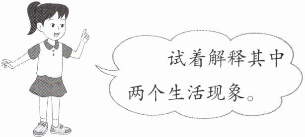 【解析】:现象一:羊油、牛油等属于液体时,分子间距离较大,具有流动性,油面是平的。当温度降低凝固成固体时,分子间距离变小,体积收缩,所以油面中间会凹下去,这是物质热胀冷缩的体现。