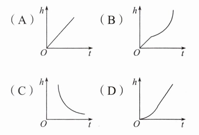 【解析】:由图可知,容器下方较宽,上方较窄。当匀速滴水时,随着水位上升,容器的横截面积逐渐变小。根据体积公式$V = S × h$($V$为体积,$S$为横截面积,$h$为高度),在体积变化率(即滴水量速度)一定的情况下,横截面积$S$越小,高度$h$的变化率越大,也就是水位上升得越来越快。因此,$h$与$t$的关系图象应该是一条斜率逐渐增大的曲线,选项B符合这一特征。