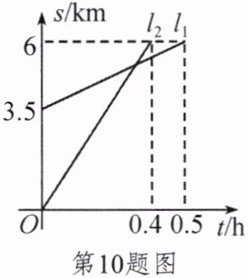 10. 学校提倡“低碳环保,绿色出行”,小明和小亮分别选择步行和骑自行车上学,两人各自从家同时同向出发,沿同一条路匀速前进。如图所示,$l_{1}和l_{2}分别表示两人到小亮家的距离s(km)和时间t(h)$的关系,出发时小明在小亮前方______$km$,出发______$h$后两人相遇。