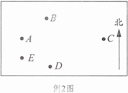 例2:如图是新时代学校的平面示意图,$A$是教学楼,$B$是实验楼,$C$是艺体楼,$D$是车棚,$E$是办公楼,请你借助刻度尺、量角器,解决下列问题: