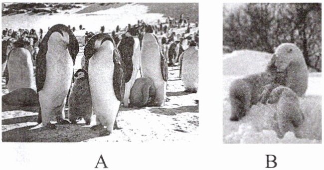 【解析】:南极的代表动物是企鹅,图中A是企鹅,所以A图是南极景观;北极的代表动物是北极熊,图中B是北极熊,所以B图是北极景观。