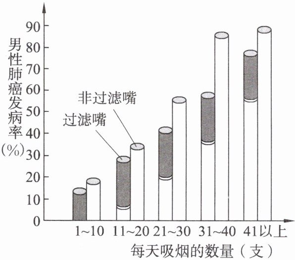 (2)观察图中数据可知,随着男性每天吸烟数量的增加,肺癌发病率整体呈现上升趋势。无论是过滤嘴香烟还是非过滤嘴香烟,在每天吸烟1~10支、11~20支、21~30支、31~40支、41支以上的不同区间,肺癌发病率大致随吸烟数量增多而提高,表明男性吸烟数量与肺癌发病率之间存在正相关关系,即吸烟数量越多,肺癌发病率越高。