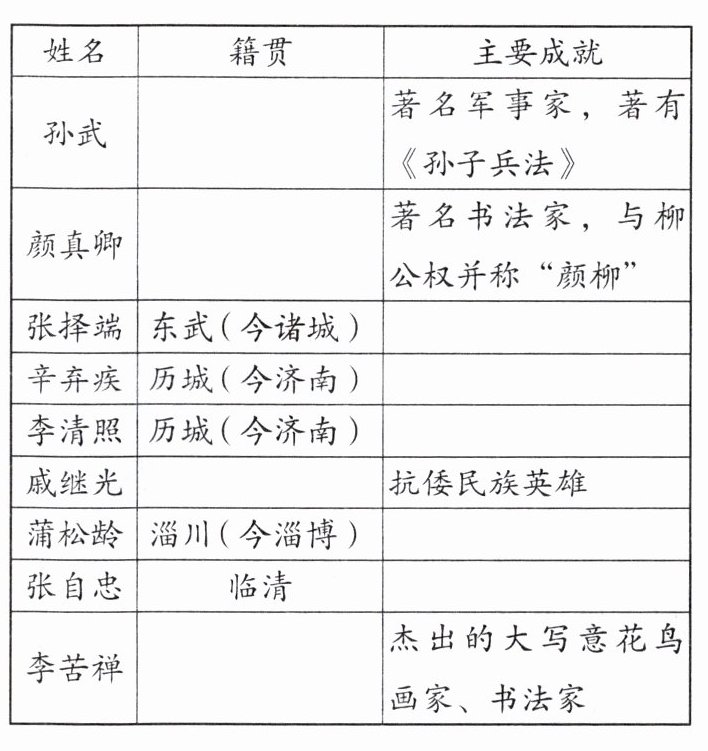 齐鲁大地人杰地灵,人才辈出。请你走访一些历史文化遗迹或者查阅相关材料,补充完成下列山东名人简表。