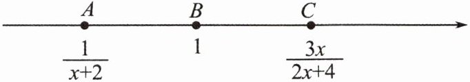 根据题意,点$A$、$B$、$C$在数轴上对应的数分别是$\frac{1}{x + 2}$,$1$,$\frac{3x}{2x + 4}$,