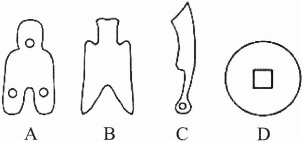 B选项(刀币):刀币的形状同样不关于某条直线或某点对称,所以它不是轴对称图形,也不是中心对称图形。