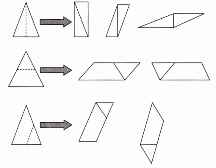 例3 王刚同学打算制作一个平行四边形纸板,但手中只有一块等腰三角形纸板,王刚同学想了一下,用剪刀只剪了一刀,便得到一个平行四边形,且纸板充分利用没有浪费。(1)你知道王刚是怎样剪的吗?用虚线表示出剪刀线;(2)请你画出王刚所拼的平行四边形。