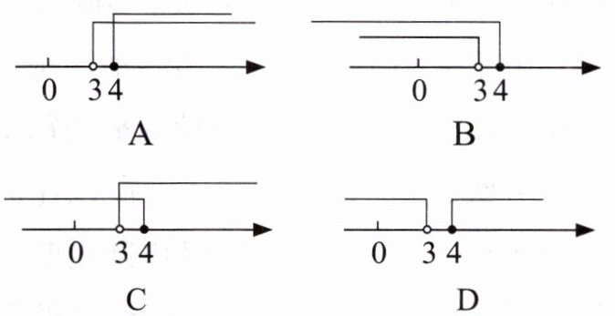 所以不等式组的解集为$3\lt x\leqslant4$。在数轴上表示时,$3$处为空心圆圈向右,$4$处为实心圆点向左,两部分的公共部分即$3$到$4$(不包含$3$,包含$4$)的区间,对应选项A。