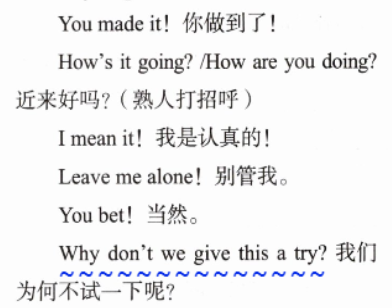 How’s it going? /How are you doing? 近来好吗?(熟人打招呼)
