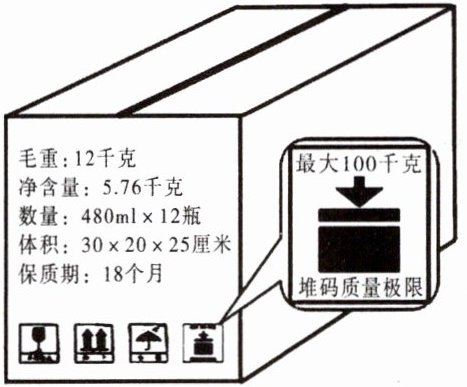 1. 一箱饮品放在水平地面上,如图所示。其包装箱上标识的相关名词如下:“毛重”是指包装箱及其内部所有物品的总质量;“净含量”是指包装箱内所装饮品的总质量;“数量”是指每瓶饮品的体积×包装箱内饮品的瓶数;“体积”是指包装箱的长度×宽度×高度。“保质期”是指包装箱内的饮品在标签指明的贮存条件下,保持品质的期限。请根据包装箱上标识的内容,通过计算回答(取$g = 10N/kg$):