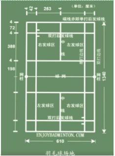 请尝试着画一个羽毛球场地示意图,并标注相关尺寸。