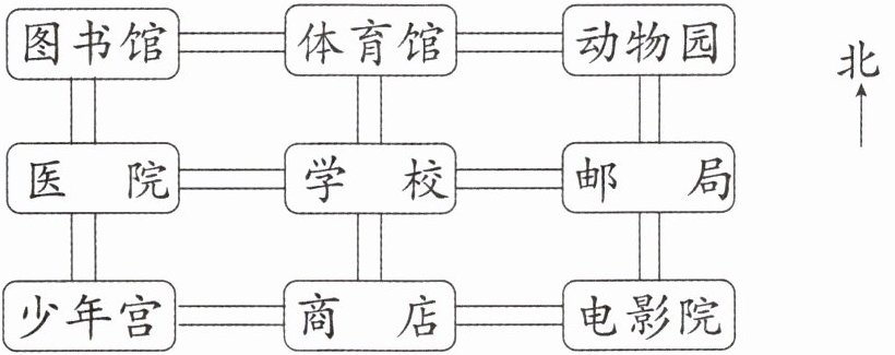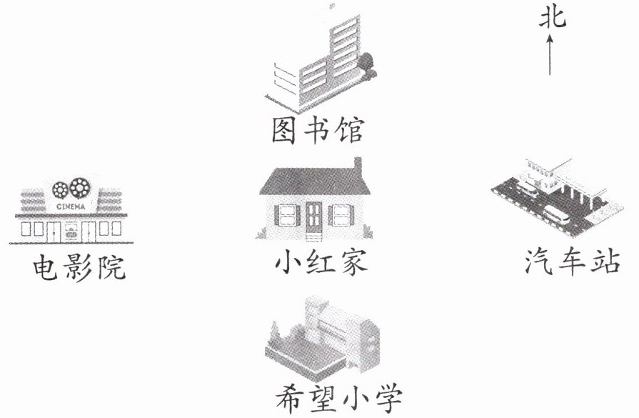 2. 说说电影院、图书馆、希望小学和汽车站分别在什么方向。(以小红家为中心)