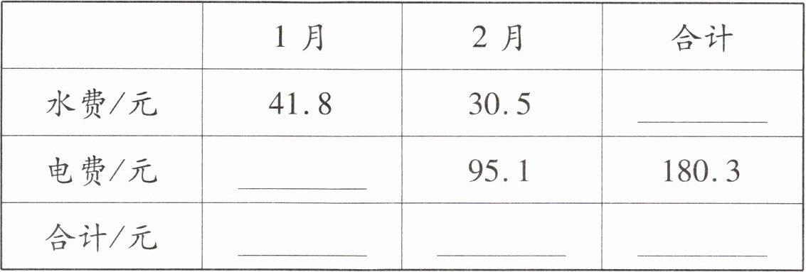 (注:因无法直接在图片中填入,根据常见表格结构,答案依次对应表格中1月水费、1月电费、1月合计、2月水费、2月合计,分别为