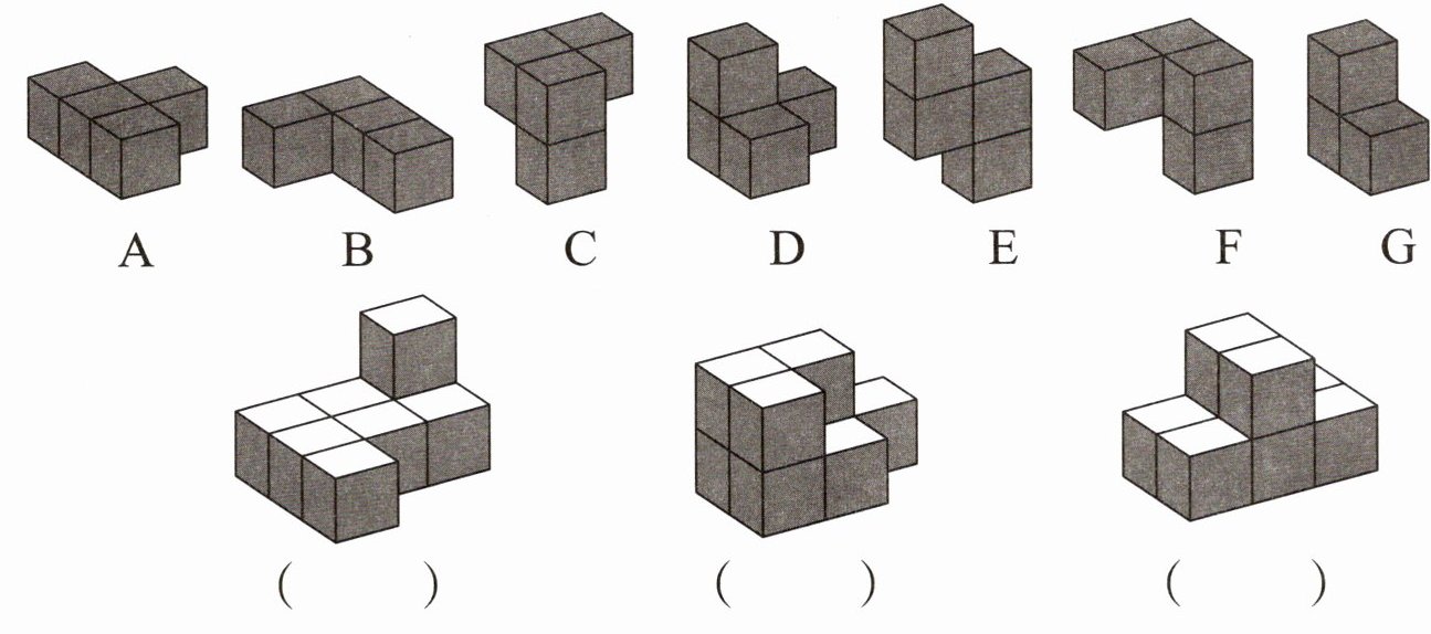 同学们,你知道索玛立方体吗?索玛立方体是由丹麦物理学家皮特·海音发明的,共有7个组块。利用这7个组块可以组成一个大正方体,还可以拼成很多美妙的立体图形。下面的几个立体图形,需要用到哪几个索玛立方体呢?研究一下吧!