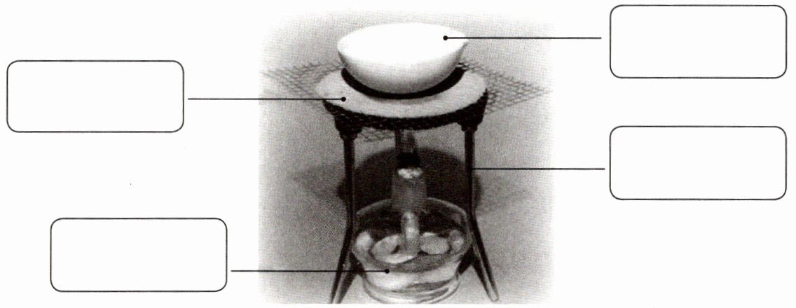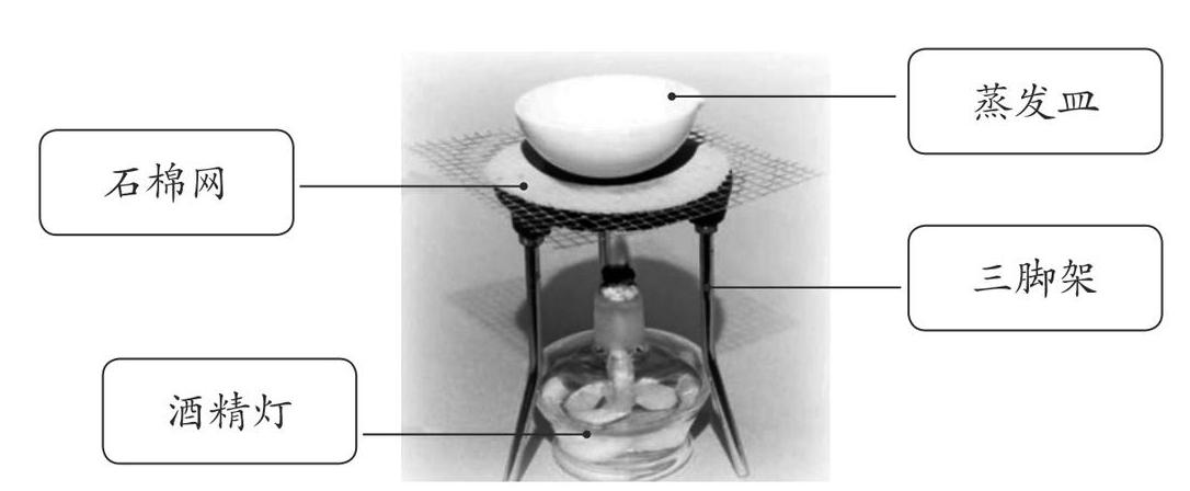 探探准备用蒸发的方法把溶解在水中的食盐分离出来。你认识这些实验器材吗?请挑选正确的实验器材名称,填写在相应的位置中。(酒精灯、蒸发皿、石棉网、三脚架)