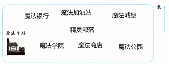 (1)请自由设计,在下图中标注出魔法加油站、魔法学院、精灵部落、魔法银行、魔法商店、魔法城堡、魔法公园的位置。