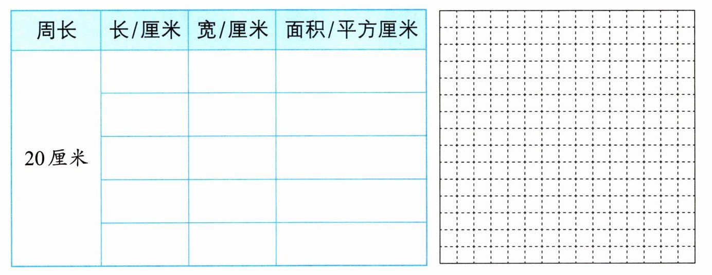 下面每个小正方形的面积代表1平方厘米,在方格图中画出周长是20厘米的长方形或正方形,你能画几个?算出它们的面积,填入表中。