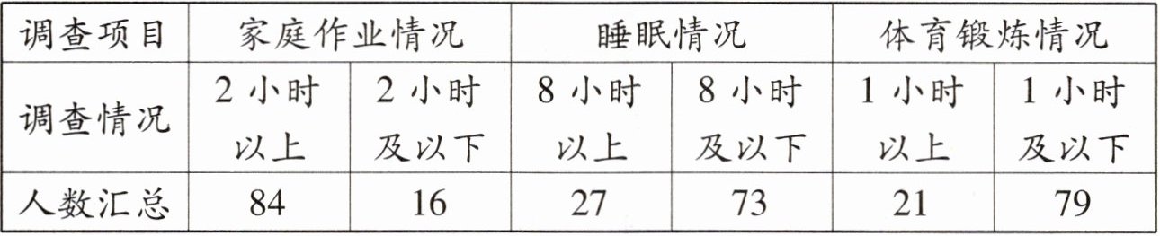 |调查项目|家庭作业情况|睡眠情况|体育锻炼情况|