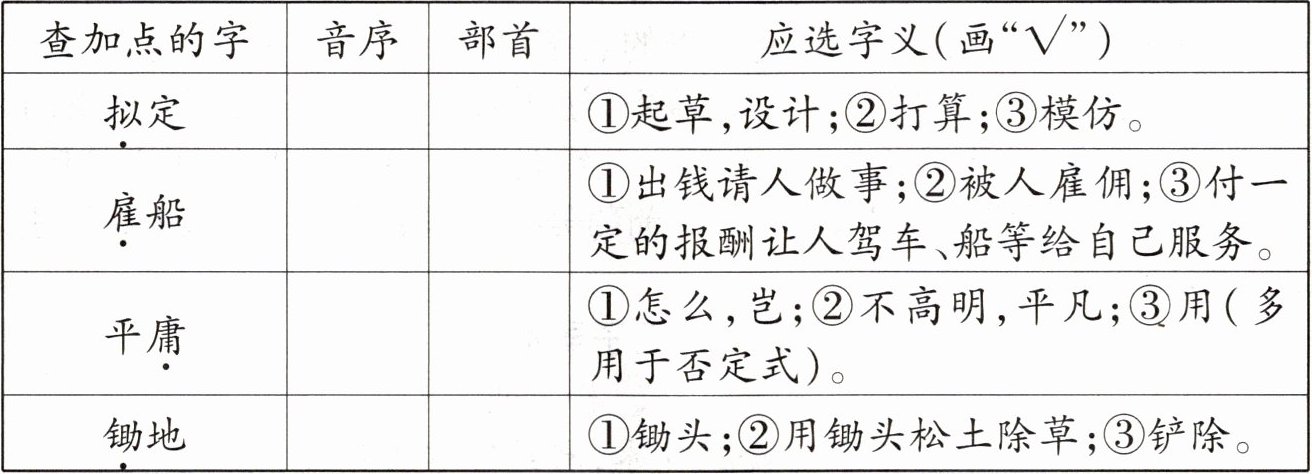 |查加点的字|音序|部首|应选字义(画“√”) |