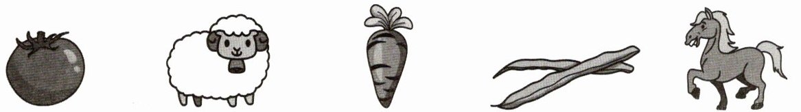 1. tomato 2. sheep 3. carrot 4. green beans 5. horse