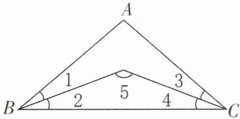 2. 如图,在三角形 ABC 中,AB = AC,∠1 = ∠2,∠3 = ∠4,∠A = 100°,求∠5 的度数。