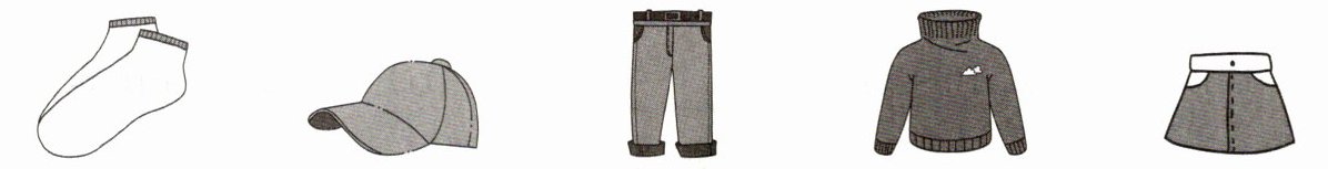 1. socks 2. cap 3. pants 4. sweater 5. skirt