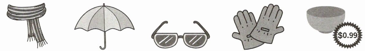 1. scarf 2. umbrella 3. sunglasses 4. gloves 5. cheap