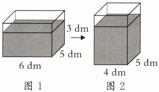 2. 有一个密闭的长方体玻璃缸,从里面量长6dm、宽5dm、高4dm,现在玻璃缸里的水深3dm(如图1)。如果竖起来(如图2),缸里的水深
