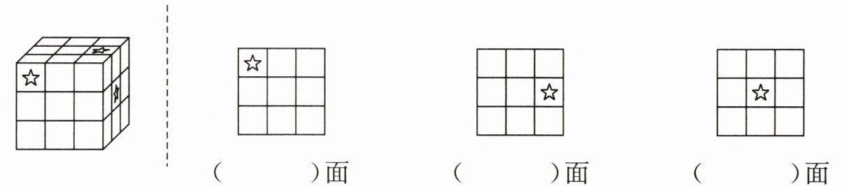 【解析】:通过观察大正方体与给出的三个平面图形,根据五角星在大正方体上的位置特征来判断。第一个平面图形中五角星的位置对应大正方体的前面;第二个平面图形中五角星的位置对应大正方体的右面;第三个平面图形中五角星的位置对应大正方体的上面。