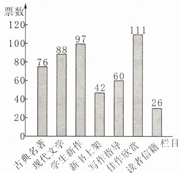 22. 某校文学社在全校范围内随机抽取一部分读者对社刊中最感兴趣的文学栏目进行了投票。每人一张选票,每张选票只能投给一个栏目,经统计无弃权票,根据投票结果绘制的条形统计图如下: