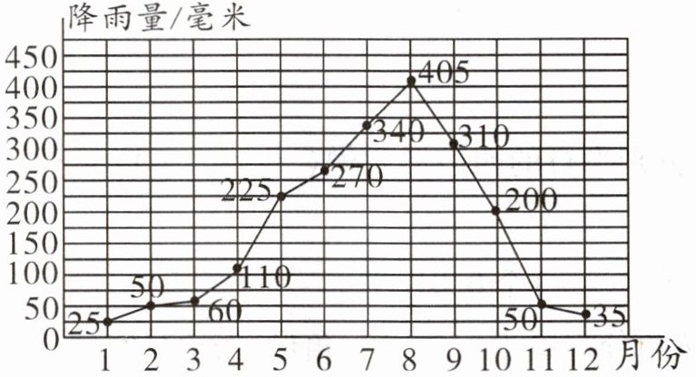 1. 从( )月份到( )月份平均降雨量逐渐增加,从( )月份到( )月份平均降雨量逐渐减少。