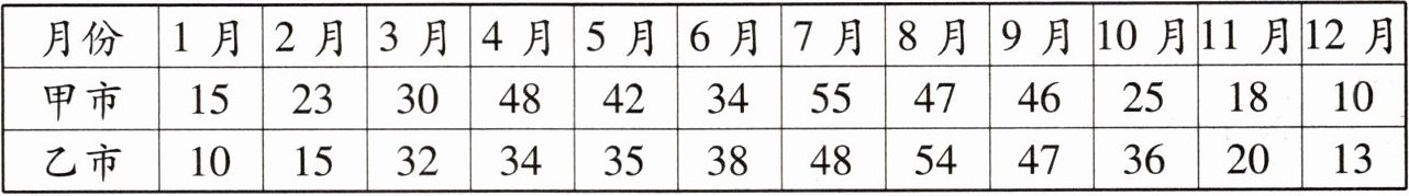 2. 甲、乙两城市哪个月降水量相差较大?相差多少?