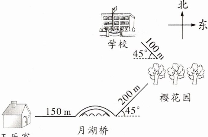 2.从学校出发,向南偏西$45^{\circ}$走$100m$到樱花园,再向西偏南$45^{\circ}$走$200m$到月湖桥,最后向正西走$150m$到家。