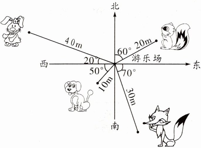 3. 松鼠在游乐场( )偏( )( )的方向上,距离是( )m。