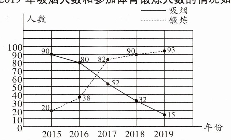 答案:2015年吸烟人数为90人,2019年吸烟人数为15人。