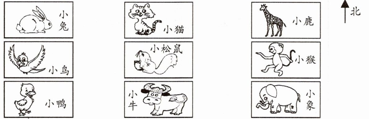 小兔在小松鼠的( )方向,小鸭在小松鼠的( )方向,小象在小松鼠的( )方向,小鹿在小松鼠的( )方向,小猫在小鹿的( )面,小鸟在小鸭的( )面,小牛在小鸭的( )面。