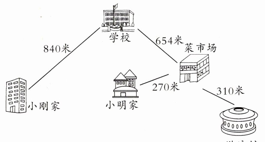 (2)从菜市场到学校比从菜市场到小明家远多少米?