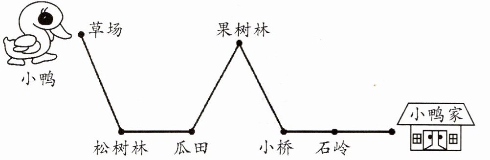 小鸭子从草场出发,先向( )走到松树林,再向( )走到瓜田,再向( )走到果树林,再向( )走到小桥,再向( )走回家。
