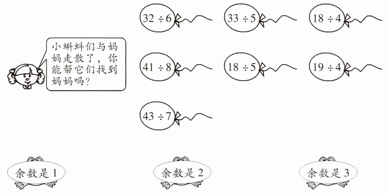 解析:本题考查的知识点为有余数的除法,通过计算各除法算式的余数来连线。