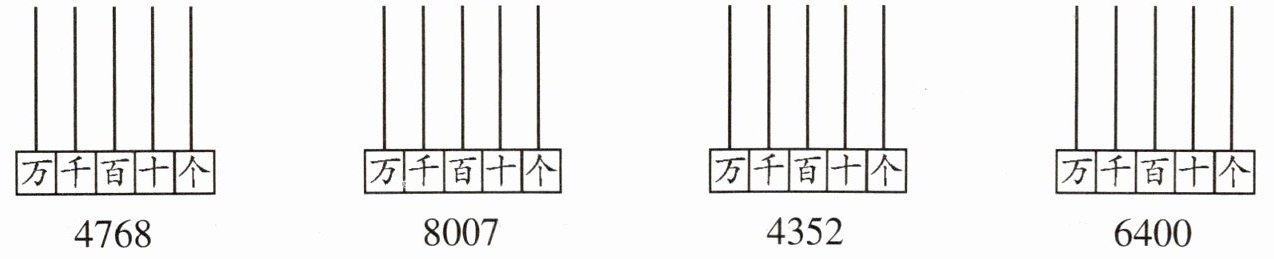 第四个计数器千位画6个珠子,百位画4个珠子,十位画0个珠子,个位画0个珠子。