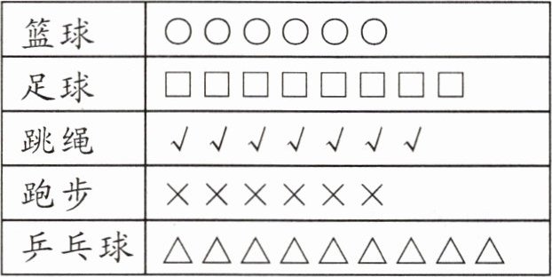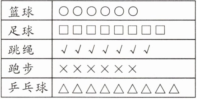 五、张明调查了二(1)班同学最喜欢的体育运动,下面是他的调查记录。