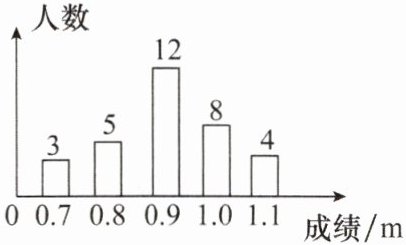 4. 体育委员对本班的立定跳远成绩作全面调查,绘成如图所示的统计图,如果把高于$0.8m$的成绩视为合格,再绘制一张扇形图,“不合格”部分对应的圆心角是(