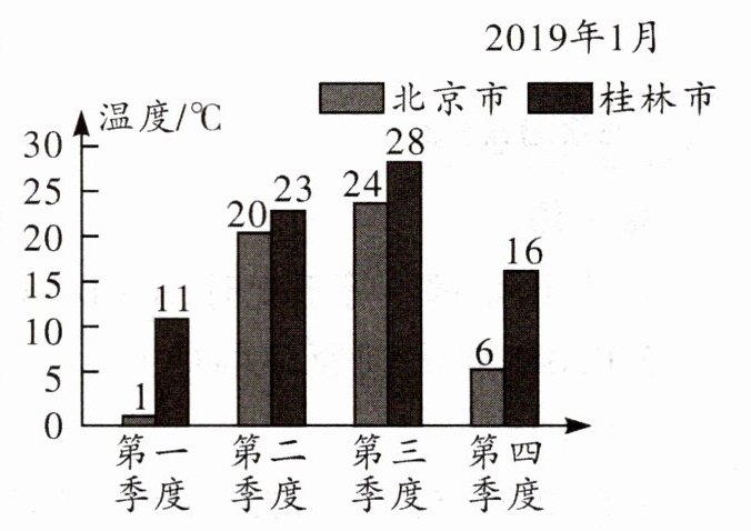1. 两地平均气温接近的是( )季度,平均气温差距最大的是( )季度。