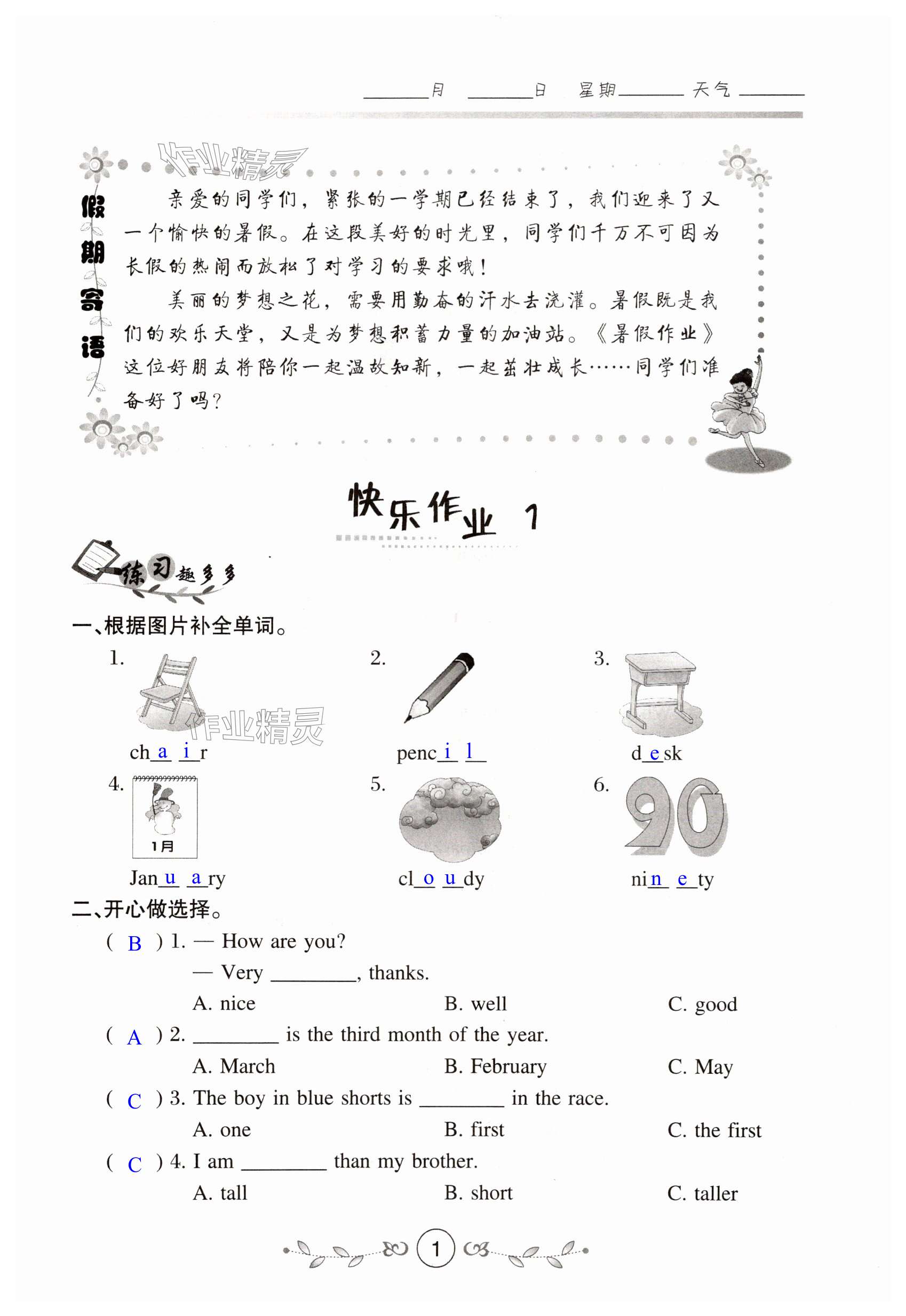 注:目前有些书本章节名称可能整理的还不是很完善,但都是按照顺序排列的,请同学们按照顺序仔细查找。练习册 2025年书香天博暑假作业西安出版社四年级英语冀教版 答案主要是用来给同学们做完题方便对答案用的,请勿直接抄袭。